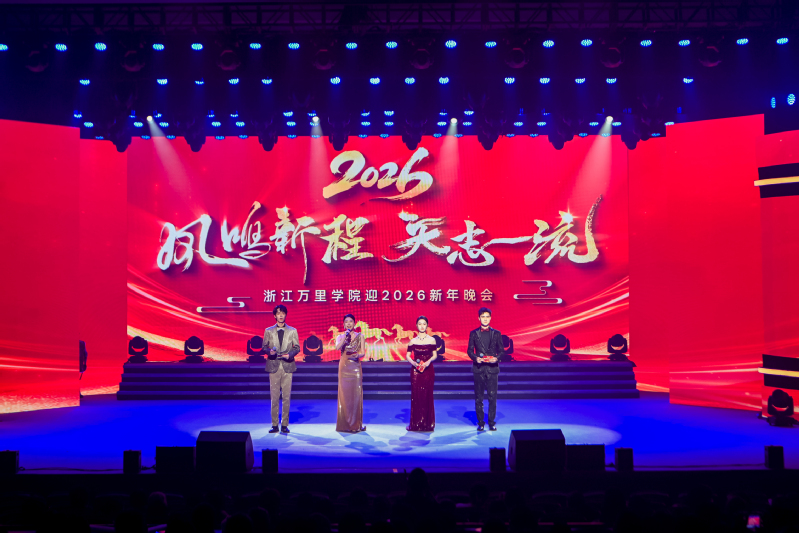 12月30日晚,浙江万里学院“凤鸣新程,矢志一流”迎2026新年晚会在钱湖校区素质拓展中心如约启幕。万里大家庭各单位领导、校友及师生代表欢聚一堂,在智能机器人热情洋溢的迎候与引领下步入会场,于欢声笑语中共叙情谊、同贺新岁,在歌舞飞扬中回望奋斗足迹、展望崭新征程。