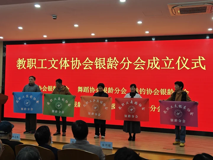会上还举行了教职工文体协会银龄分会成立仪式,并为摄影、垂钓、舞蹈、乒乓球、太极拳等5个分会授旗。