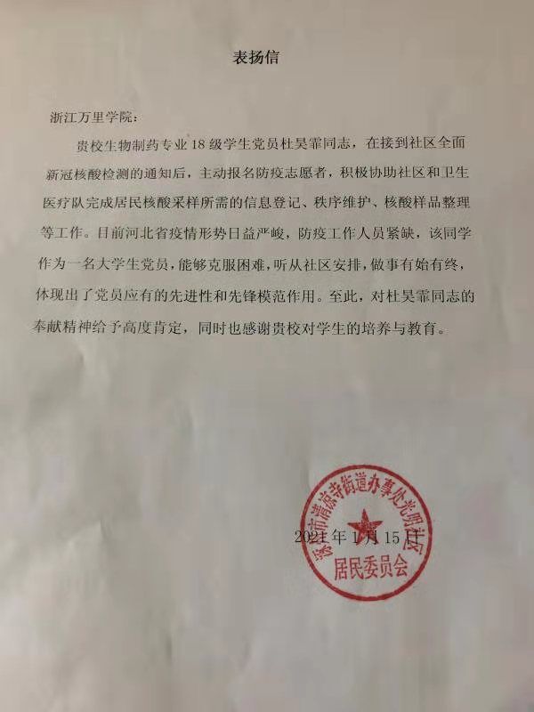 “杜昊霏同志作为一名大学生党员,主动报名防疫志愿者,我们对他的奉献精神给予高度肯定,也感谢贵校对学生的培养与教育。”近日,我校收到了一封来自河北省涿州市清凉寺街道办事处光明社区居民委员会的表扬信,信中高度赞扬了生物与环境学院河北籍学生党员杜昊霏在疫情期间的志愿者工作。