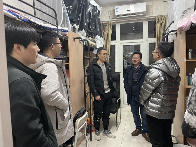 王伟忠一行走访了留校学生寝室,向同学们送去学校的深切关怀和新春祝福。王伟忠仔细了解同学们的留校原因和学习生活情况,并向他们送上新春慰问礼包,勉励他们在充分利用假期时间充实自己的同时要注意劳逸结合,叮嘱大家要遵守疫情防护相关规定,定期与家人联系,注意假期安全。