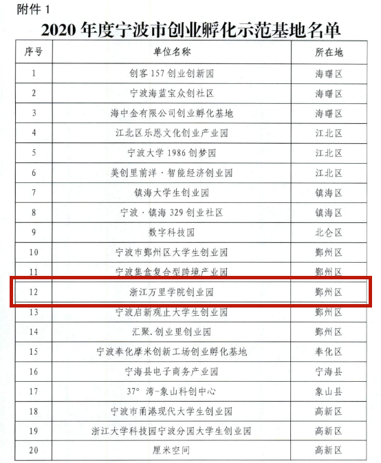 近日,宁波市人力资源和社会保障局发文公布了2020年度宁波市创业孵化示范基地、宁波市大学生就业实践(示范)基地名单。我校大学生创业园再度获评“2020年度宁波市创业孵化示范基地”,获评本项荣誉的全市共20家单位。