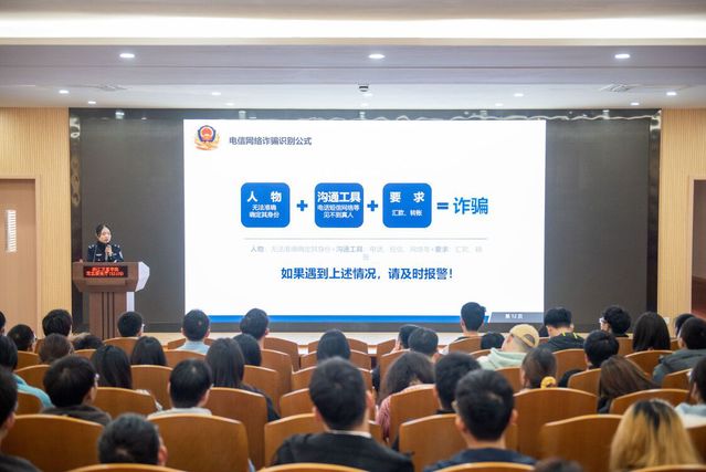 文华派出所张沁馨警官作“防范通信网络诈骗教育”法制教育专题讲座,讲座从近年电信网络诈骗发生情况、诈骗案件类型、相关预防及补救措施等三个方面展开,以反电信网络诈骗系列微视频和辖区内的真实事件为引,生动形象地介绍了八种电信网络诈骗的常见形式,同时,现场教授“三不一要”反诈小口诀——不透露、不轻信、不转账、要及时报警,尽早追回损失。