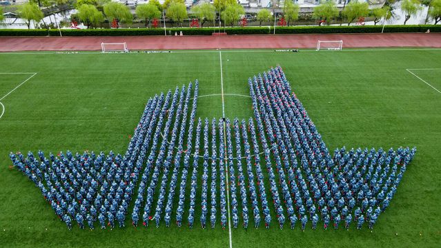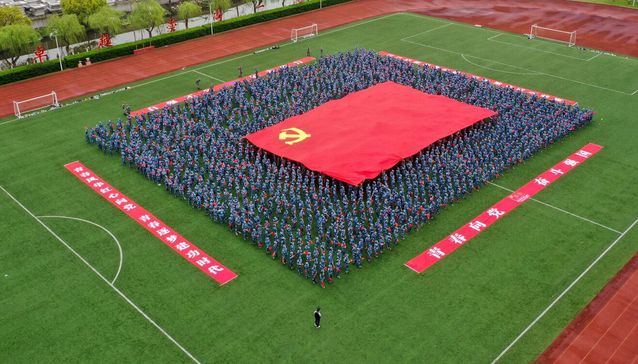 素拓中心,500名学生用歌声开启了《新时代的国防教育》的专题讲座;操场上三个营的2000名学生依次通过手中旗帜摆放出红船、100等造型,深情告白伟大的中国共产党。当巨大的党旗从头顶经过,同学们深情演唱《没有共产党就没有新中国》,歌声响彻回龙校园的上空。