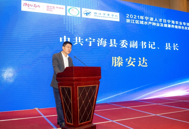滕安达致辞,他对各位领导和专家齐聚宁海,共商浙江水产种业和健康养殖大计表示热烈欢迎和诚挚感谢。滕安达说,宁海县是浙江省海水养殖大县,具有悠久的水产养殖历史,在养殖模式和养殖技术创新方面积累了丰富的经验和成果,贝、虾、鱼、蟹等种苗生产和养成技术水平在国内居于前列,荣获“中国蛏子之乡”称号。然而,在水产种质创新和良种创制、健康养殖和绿色发展方面,宁海县迫切需要借智借力高校和科研院所,加强联合技术攻关,为此宁海县人民政府与浙江万里学院合作建立了浙江万里学院宁海海洋生物种业研究院。目前该研究院发展势头良好,现在从国家布局水产种业发展来看,这项合作具有前瞻性,在宁波市甚至浙江省水产种业创新和发展中必将发挥重要作用。他希望各位领导和专家不吝指导和帮助,促进宁海海洋渔业经济的转型升级和提质增效。