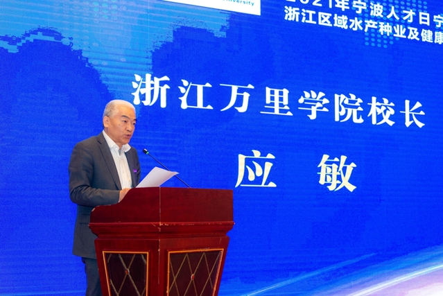 应敏在随后的致辞中表示,浙江万里学院是一所具有71年办学历史的省属普通本科高校,现有13个二级学院,51个本科专业(国家一流专业9个)、2个专业硕士学位点,全日制在校本科、硕士、留学生2万余人。学校具有悠久的农学人才培养历史经验和丰厚的科学研究成果积累。在传承农学优势学科的基础上,近十年大力发展水产学科,已建成国家海洋局海洋生物种质资源高效利用协同创新公共服务平台、浙江省水产种质资源高效利用技术研究重点实验室、宁波区域特色水产种业协同创新中心等高水平研究创新平台,在水产良种培育、健康养殖、病害防控与环境修复等领域取得优异成绩,部分研究成果处于国内领先水平。学校始终把服务地方经济和产业、促进成果转化作为使命担当,在宁海县领导的关心支持下,借助中国海洋大学的智慧和力量,在包振民院士、刘少军院士等国内顶级专家团队的支持下,学校与中国海洋大学、宁海县人民政府合作创建浙江万里学院宁海海洋生物种业研究院,旨在建成海洋水产种业高层次人才集聚平台和高水平科研创新平台、水产良种良法成果转化及技术转移中心、高质量公共服务和高素质应用型人才培养基地,从而进一步实现宁海农业产业从种子、养殖、颜值到价值的升级与升华,进一步全面构建产业链——创新链——人才链——教育链的深度对接和融合,力求做到知行合一、顶天立地。