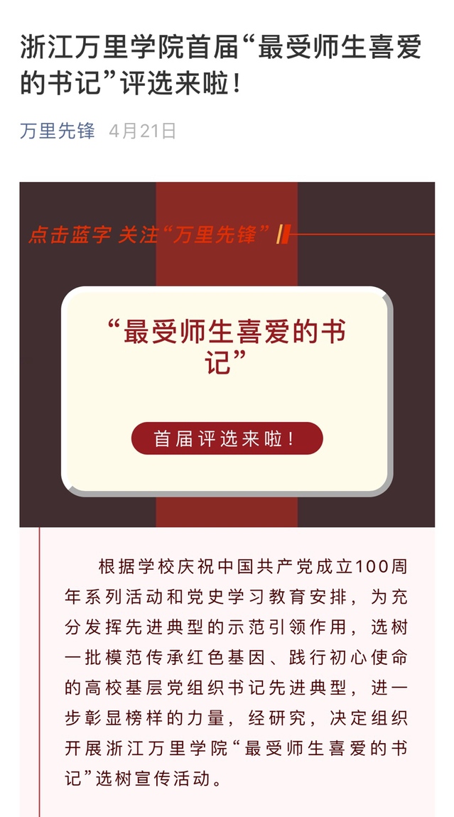 根据学校庆祝中国共产党成立100周年系列活动和党史学习教育安排,为充分发挥先进典型的示范引领作用,选树一批模范传承红色基因、践行初心使命的高校基层党组织书记先进典型,进一步彰显榜样的力量,近期,学校党委组织开展了首届“最受师生喜爱的书记”选树宣传活动。