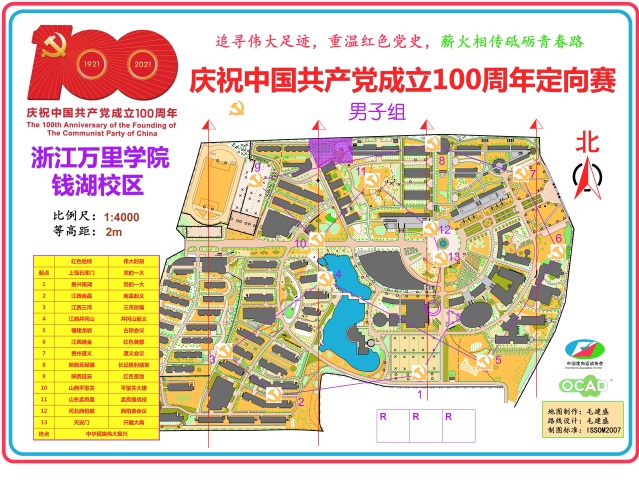 “定向运动就是运动员以最短时间按顺序找到地图上所标示的点,本次定向赛将党史学习教育融入定向运动,可以说是一堂‘行走的党课’。”比赛组织老师毛建盛说道。比赛将地图上的点设计为我党重要历史时刻的红色地标,整个比赛路线设计为,从上海石库门(党的一大会址)为起点,历经南湖、南昌、三湾、井冈山、古田、瑞金、遵义、吴起镇、延安、平型关、孟良崮、西柏坡,直到天安门,终点为中华民族伟大复兴,运动员完成一场比赛犹如重走一遍党的伟大征程。