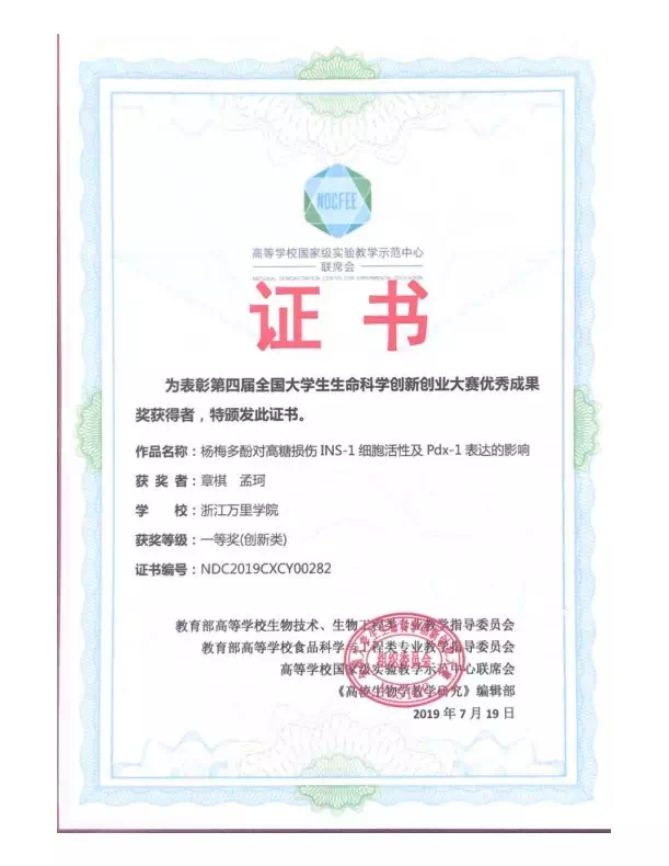 在第四届全国大学生生命科学创新创业大赛上,我校参赛作品获一等奖2项,二等奖4项,三等奖8项,获奖成果位列省属高校第五位。同时,我校获优秀组织奖。此次大赛,浙江省内高校共获特等奖6项,一等奖35项,二等奖28项,三等奖23项。