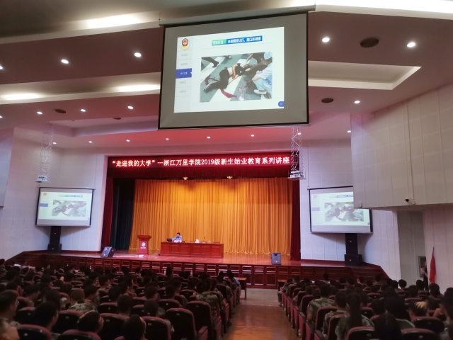 为加强新生校园安全意识,构建和谐稳定校园,9月12日上午,回龙校区举办2019级新生始业教育系列讲座之安全教育讲座。宁波市招商银行业务主管张卿瑜、宁波市公安局交通警察局鄞州大队教导员胡畏、宁波市公安局邱隘派出所民警俞伟、我校保卫部副部长凌亚飞分别从金融电信诈骗、交通安全、治安安全、传染病防治四个方面作讲解。