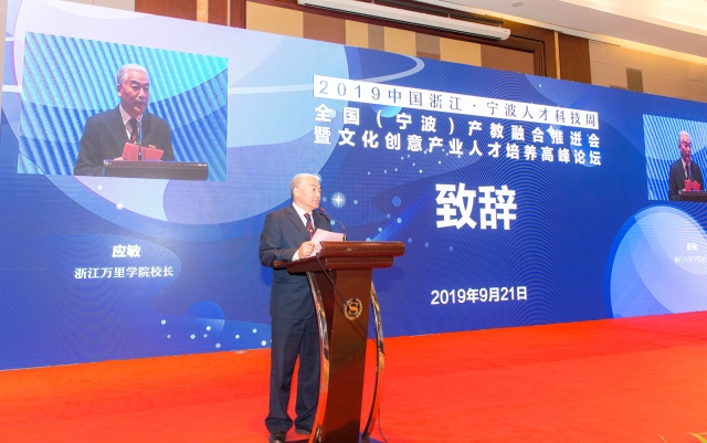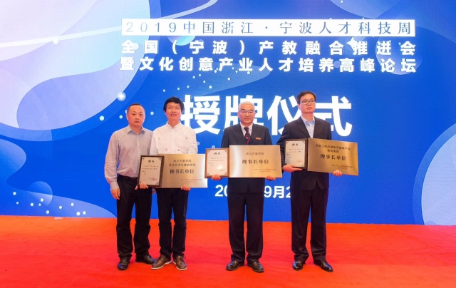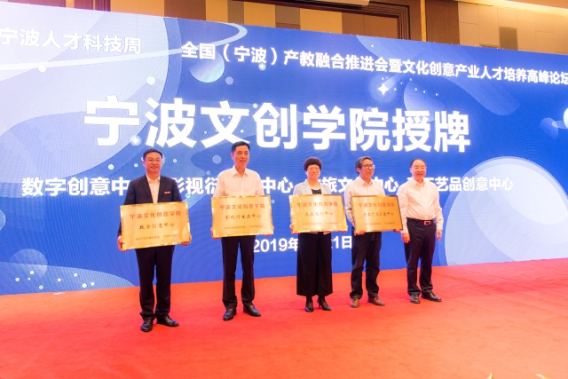 在9月21日召开的全国(宁波)产教融合推进会暨文化创意产业人才培养高峰论坛上,中国高等教育学会监事长孙维杰,中共宁波市委常委、宣传部长万亚伟出席开幕式并致辞。宁波市教育局党委书记、局长朱达主持开幕式,我校校长应敏主持论坛主题演讲。会上,我校接受了宁波文化创意学院“宁波文创学院数字创意中心”的授牌,同时我校设计艺术与建筑学院海曙区横街镇惠民村团队、北仑区白峰街道下阳村团队,分获2019“创意点亮乡村”暑期行动最佳创意奖及最佳设计奖。