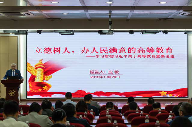 10月29日下午,应敏校长在图书馆报告厅讲授“立德树人,办人民满意的高等教育”的主题教育专题党课,学校领导班子成员、全体中层干部、党支部书记参加。根据要求,在前期理论学习所思所悟和深入调研体察感受的基础上,应敏围绕习近平总书记关于教育的重要论述这一主线,结合当前学校发展实际,从“理论范畴与思想光芒”“立足现实与面向未来”“遵循论述与知行合一”三个方面重点进行了梳理阐释和系统分析,理论和实践结合,学习与创新结合,指向学校创新发展和内涵提升。