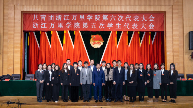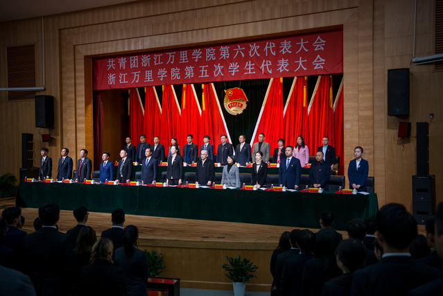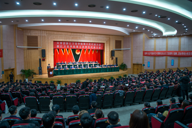 12月6日下午,在校党委和团省委、省学联的亲切关怀下,共青团浙江万里学院第六次代表大会、浙江万里学院第五次学生代表大会在学术报告厅胜利召开。团省委副书记周苏红、学校部部长王炜、省学联执行主席孙雅阁,团市委副书记俞欢欢、学少部部长张旦旦、市学联驻会主席傅江豪,校长应敏,党委书记蒋建军,党委副书记王伟忠,党委委员、纪委书记孙斌,校工会主席陈建荣,党委委员、秘书长、宣传部部长王福银,党委委员、组织部部长、统战部部长朱邦相等校领导出席大会。相关职能部门负责人、各分党委(党总支)书记、副书记以及18所兄弟高校团委、学生会负责人应邀参加会议。来自全校各级团组织的251名正式代表,肩负全校近2万名团员青年的期望和重托齐聚一堂,共谋未来。