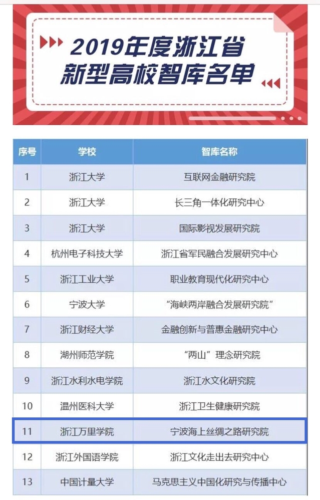 根据《浙江省教育事业发展“十三五”规划》《浙江省高等教育“十三五”发展规划》,经高校申报、专家认定、公示等环节,并报经厅长办公会议审议通过,近日,省教育厅认定2019年度浙江省新型高校智库13个,我校“宁波海上丝绸之路研究院”上榜,也是宁波市两家上榜高校智库之一