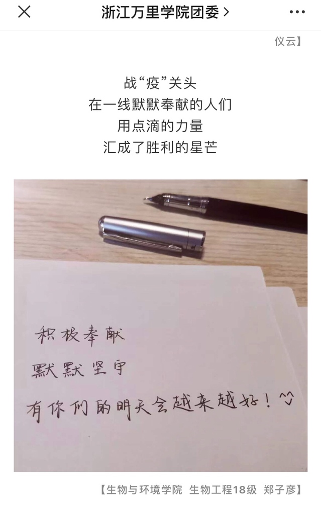 敢于担当,争做表率。在校团委的积极引导下,身处祖国各地的万里学子通过在家手写祝福的方式为祖国加油。团员青年以不同方式支持疫情防控,进行科学知识宣传,参与社区疫情防控志愿者等工作。自发组织捐款助力抗击疫情,商学院、物流与电子商务学院捐款15000余元。