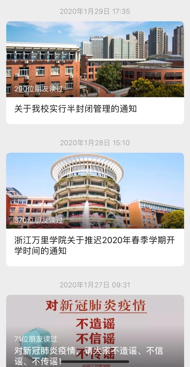及时研判,迅速行动。学校党委密切关注疫情动态,坚决落实上级指示精神,对学校疫情防控工作及时研判、周密部署。1月22日,成立学校疫情防控工作领导小组,下发《关于做好防控新型冠状病毒感染的肺炎疫情工作的通知》,就疫情防控全面部署;1月26日发布《浙江万里学院关于2019-2020学年寒假学生不提前返校的通知》,确保广大师生身体健康和生命安全;1月27日、1月31日分别发布《浙江万里学院致全体同学做好疫情防控工作的倡议书》《致浙江万里学院广大师生的公开信》,提醒广大师生科学防范疫情,做好自我防护,并提出不造谣、不信谣、不传谣等要求;1月28日发出《关于推迟2020年春季学期开学时间的通知》,学生原定返校、教职工返岗时间延期至2月17日以后,教学、实习、实践等活动一律停止和取消;1月26日、1月29日、1月31日、2月3日,相继发出疫情期间加强校园管理的通知,对校园实行半封闭、封闭管理。1月30日,为进一步落实工作主体责任,及时充实调整领导小组,成立以校长应敏、党委书记蒋建军为组长,其他校级领导为副组长,各二级学院院长、书记和职能部门负责人组成的疫情防控工作领导小组。领导小组下设办公室、学生组、外籍(港澳台)师生组、教工组、后勤保障组、教学业务组、督查检查组、学校教师公寓组等,确保防控工作形成闭环。