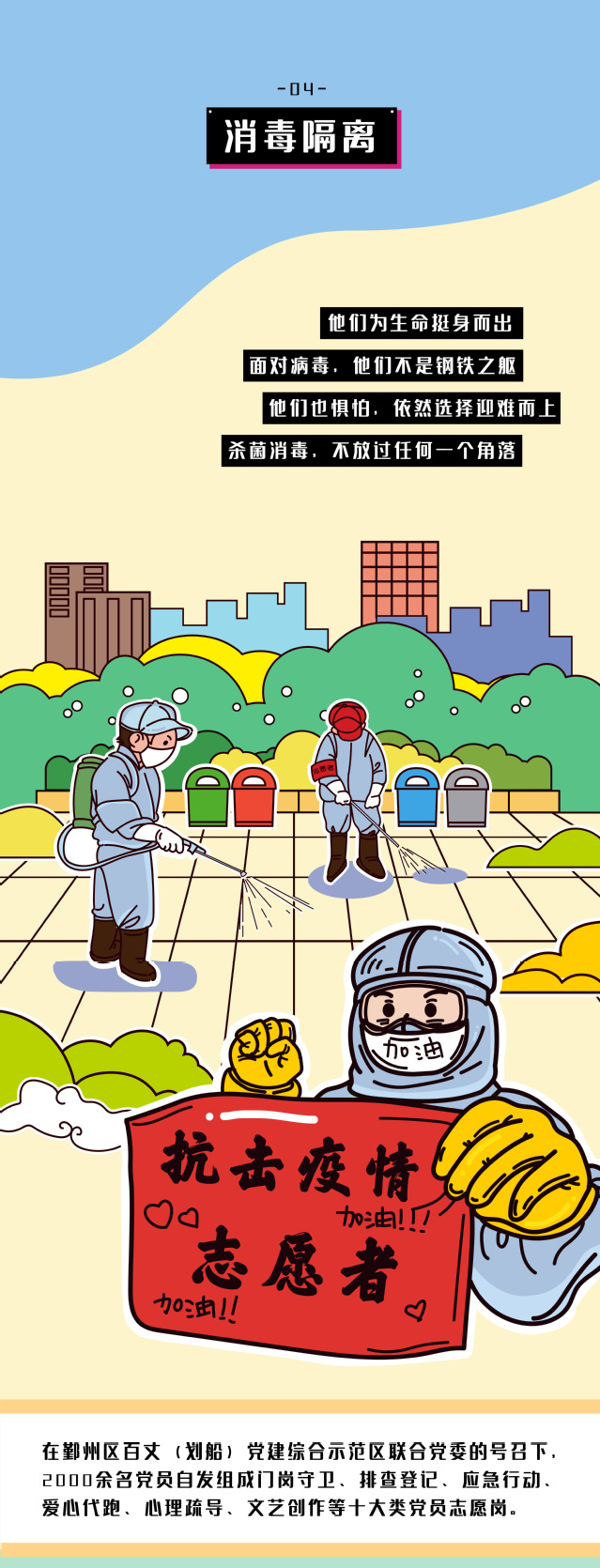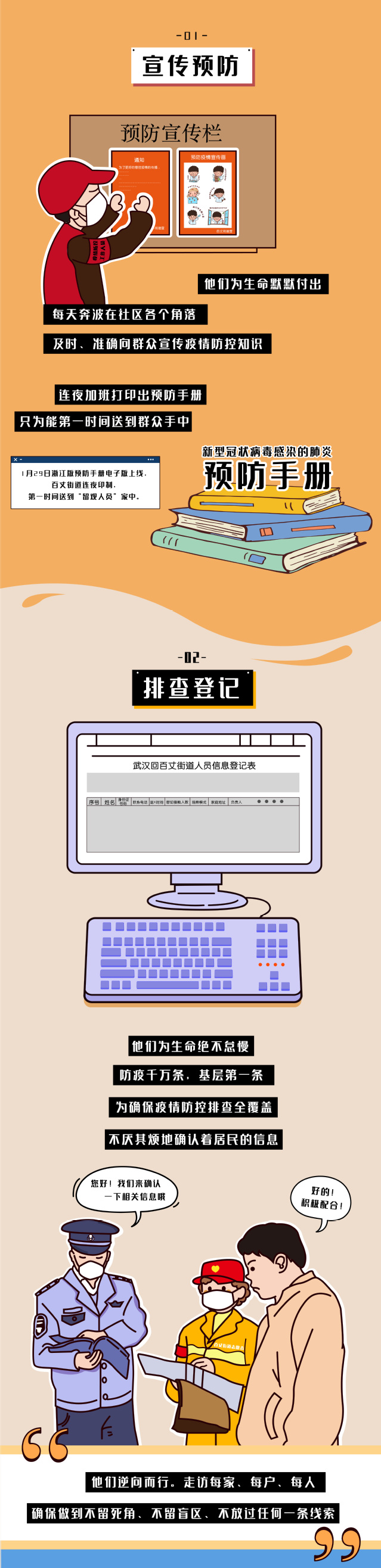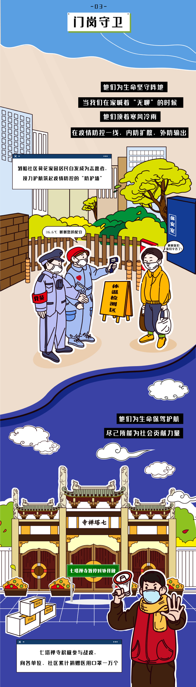 这份“抗疫日记”手绘长图图文并茂,生动真实地反映了百丈街道社工、公安干警、城管执法队员这些一线抗疫工作者及志愿者们连续20多天的工作实况,林智诺、黄译葶两人花费4天创作完成。