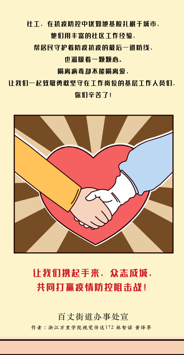 “我曾作为志愿者走进百丈街道七塔社区,与社区工作人员一起助力文明城市建设。 在活动中我了解到,百丈街道地处宁波市中心城区,老旧社区较多,包含了多个学校、市场、公园,人流密集,环境压力大。” 作品主创林智诺说,疫情爆发以来,她时刻关注相关新闻报道,深感百丈街道基层工作人员疫情防控的不易,因此萌发了利用专业所学,为百丈街道贡献一份力量,同时也希望社会上更多的人关注基层工作者,关注身边的平凡英雄。