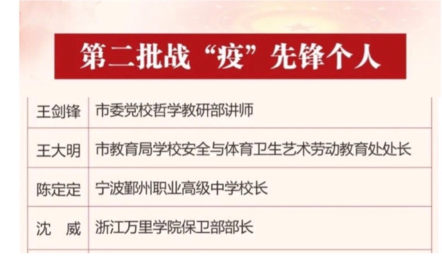2月25日,宁波市委组织部发布第二批《关于表扬在疫情防控一线表现突出的战“疫”先锋团队和个人的通报》,对38个战“疫”先锋团队、106名战“疫”先锋个人给予表扬。我校保卫部部长沈威上榜。