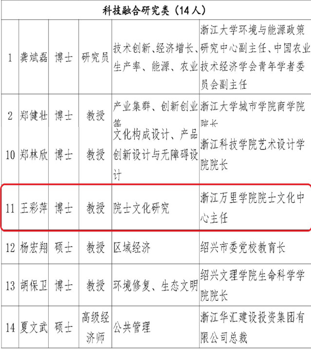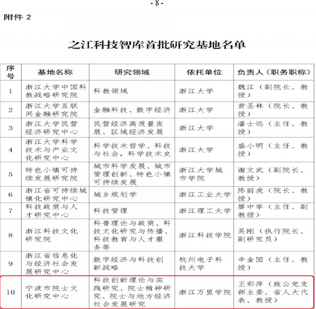 在此次公布的研究基地名单中,浙江万里学院“宁波市院士文化研究中心”与浙江大学、浙江工业大学等19家高校和研究机构共同被认定为首批研究基地。该研究中心的研究领域聚焦在科技创新理论与实践、院士精神、院士与地方经济社会发展等方面。同时,在已发布的49位智库委员会委员名单中,我校王彩萍教授入选为之江科技智库首批学术委员会“科技融合研究类”委员。