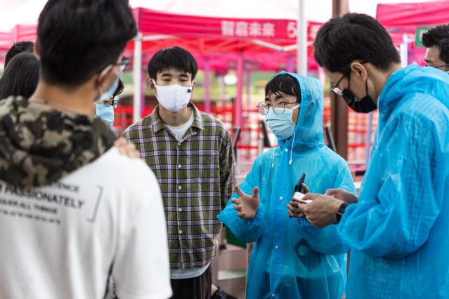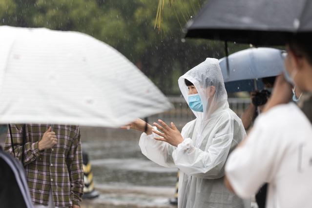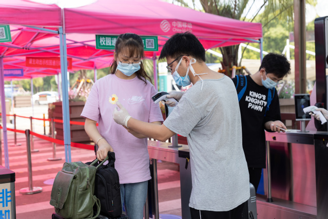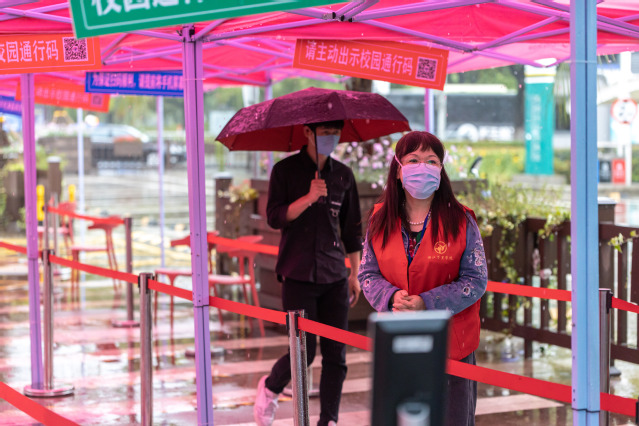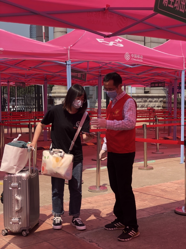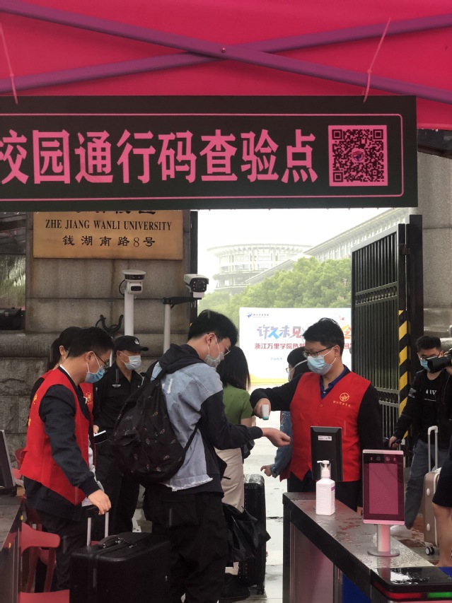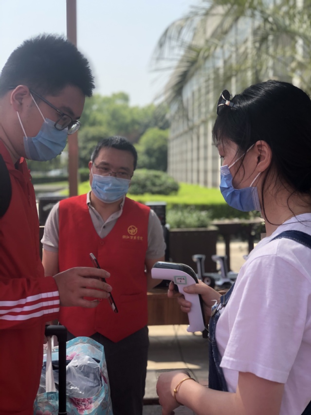 从早上7:30到晚上20:00,无论骄阳似火,还是刮风下雨,他们都坚守在报到处,一次测温、二次测温、查验甬行码、录入校园通行码,大家忙而有序,一丝不苟做好各项检测、审核、查验、放行等工作。