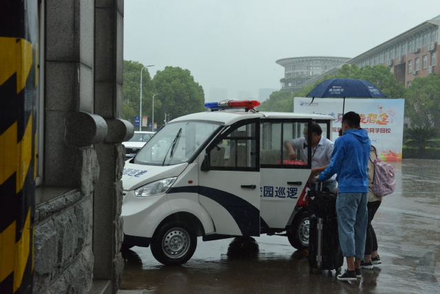 5月5日,天空下着大雨,雨棚挡不住风雨的脚步,雨淋湿了衣服,打湿了鞋子,但大家毫不松懈,依然在风雨中坚守岗位,还贴心地帮学生搬运行李。