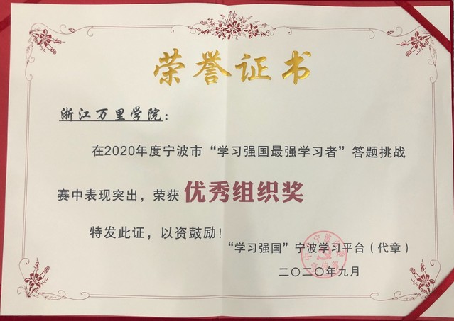 据悉,为提高广大“学习强国”宁波学员的学习热情,展现宁波学员的学习风采,2020年6月19日起,中共宁波市委宣传部、“学习强国”宁波学习平台联合宁波广电集团宁聚新闻客户端重磅推出“学习强国”最强学习者答题挑战赛,8期线上比赛至8月12日落下帷幕。我校党委高度重视本次活动,在学校党委宣传部和党委组织部的号召下,基层党组织、各单位和部门认真组织开展答题挑战赛活动,广泛发动广大党员群众参与每一期挑战赛。我校共有19127人(次)参与活动,连续七期位居市“先锋旗帜榜”榜首。