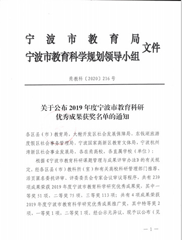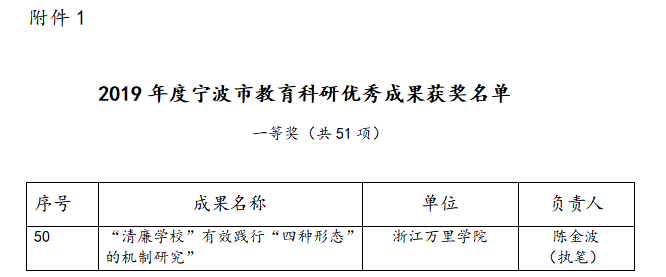 近日,宁波教育局、宁波市教科规划领导小组发文公布了2019年度宁波市教育科研优秀成果获奖名单,我校基础学院教师陈金波同志主持完成的《“清廉学校”有效践行“四种形态”的机制研究》获宁波市教育科研优秀成果一等奖。