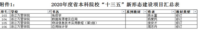 近日,浙江省高等教育学会公布了2020年省普通高校“十三五”新形态教材建设项目评选结果,我校4部教材获得立项,分别为《免疫学》(陈永富主编)、《数据库原理及应用》(杨爱民主编)、《物流信息技术实用教程(第3版)》(侯安才主编)和《应用统计学》(周志丹主编)。