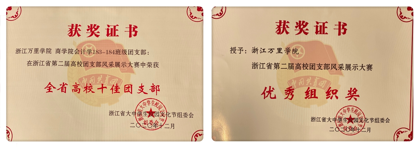 12月30日,浙江省第二届高校团支部风采展示大赛决赛在中国计量大学落下帷幕,商学院会计学183-184班级团支部荣获“全省高校十佳团支部”,学校获“优秀组织奖”。