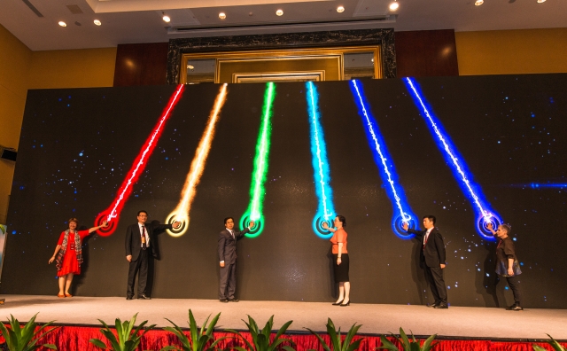 宁波市副市长许亚南、浙江省教育厅副厅长于永明、浙江省万里教育集团董事长应雄、北外副校长孙有中等为联盟揭牌。