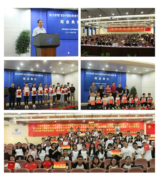 6月20日下午,我校“双百+”优秀大学生骨干培养工程(第一期)结业典礼在图书馆报告厅隆重举行。校党委书记蒋建军、校长助理林志华、校秘书长王福银与其他六位导师作为导师代表与100学员们一起见证了第一期“双百+”学员们的顺利结业。