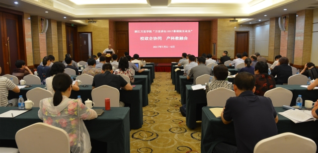 7月5日,在校长应敏的主持下。各二级学院负责人展开了精彩的论见,商学院孟祥霞、物流与电子商务学院楼百均、法学院盛钢、文化与传播学院陈志强、外语学院莫莉莉、设计艺术与建筑学院周斌、生物与环境学院杨震峰、电子与计算机学院梁丰、基础学院张萱、创新创业学院高玉宇分别就各自学院在过去一年所取得的成绩以及未来的发展规划作了详细介绍,同时提出了自己的建议与想法。论见中,“融合、交叉、创新、合作、机遇、平台、国际化”不约而同的成为了每个二级学院的关键词,“这体现的是我校在应用型大学建设过程中的一种方向。”应雄董事长说道。