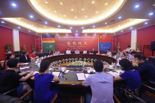万里教育集团董事长应雄、万里教育集团副总裁吕洁、浙江万里学院校长应敏、浙江万里学院副校长钱国英,汉堡设计与传播应用科学大学校长Shan Fan教授、品牌管理和传播系系主任 Joachim Bongard教授、品牌设计系系主任 Ansgar Eidens教授、Stefan Waller教授以及双方相关负责人等出席了签约仪式。