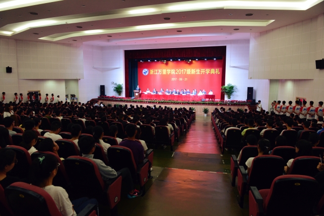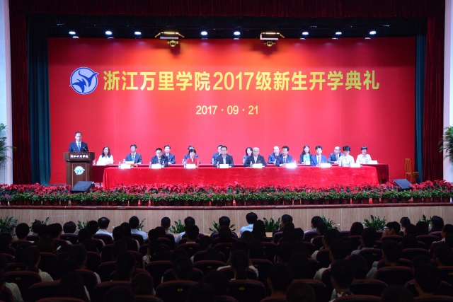 9月21日,我校2017级新生开学典礼在回龙校区隆重举行。浙江省万里教育集团董事长、党委书记、浙江万里学院董事会执行董事长应雄,校长应敏及学校领导班子成员、各二级学院院长、书记,以及近5000名2017级本科生、研究生新同学参加了本次开学典礼。本次开学典礼以基础学院素拓中心为主会场,各阶梯教室为分会场进行实时直播。校党委书记蒋建军主持典礼。