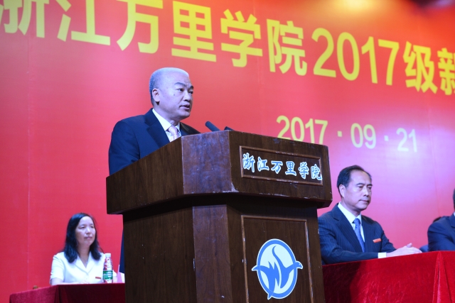 校长应敏发表讲话,他代表学校向全体2017级新同学表示最热烈的欢迎,欢迎每一位新生加入到“万里学子的大家庭”中来。应敏说道,大学不是高考胜利后的疗养院和游乐场,而是人生旅程的新灯塔和加油站;大学将助力你们成就高尚之德行、独立之人格、博雅之学识、卓越之能力,坚韧之意志、健康之体魄、仁义之良知、爱国之情怀。同时,应敏对每一位新同学寄予厚望,希望同学们在未来四年的大学时光里,怀抱理想,努力学习,要学会修身立德、学会修心励志、学会修学致知、学会修为笃行。要尽快适应大学环境,做到知行合一,用最佳的方式打开大学生活。