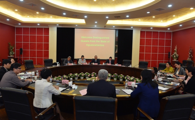 应敏首先对学校的办学历史、办学定位、国际化办学等方面做了介绍,并提到我校曾在2007-2008两年中连续接待过2批来自阿瓜斯卡连特斯州的学生,双方结下了友谊的种子,期望访问团的此次来访可以进一步加强我校与阿瓜斯卡连特斯州在教育领域的合作。Martin Orozco Sandoval州长做了积极回应,表示这正是他此行的目的,为阿瓜斯卡连特斯州的青年学生打造更大的海外学习平台,推动州内高校的国际化发展。钱国英详细介绍了各学院特色、强势专业、国际交流合作项目等内容,使访问团对我校有了更深入的了解。最后双方就可合作的领域、专业进行了进一步讨论,达成共识,有望于明年启动学生交流项目。