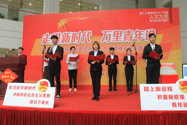 随后在“走进新时代,万里青年说”团学组织学习宣传贯彻党的十九大精神主题实践活动中,由校吻火诗社带来的学生原创诗歌《听,是谁在召唤》诗朗诵,表达了万里学子向新时代、新思想、新蓝图、新征程致以青春的敬意。校级学生组织制作了《学习宣传贯彻党的十九大精神》手绘本,表达了争做担当民族复兴大任时代新人的实践决心,学校团委启动了线上“我正在参与的学习宣传贯彻党的十九大精神”互动接力活动,以青年学生喜闻乐见的形式学习宣传党的十九大精神。