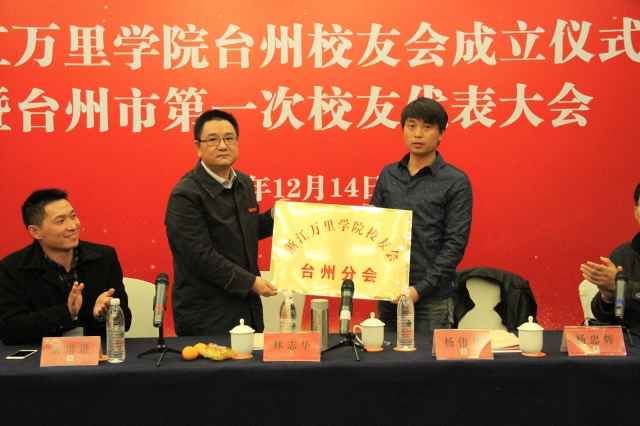 会议审核通过了浙江万里学院校友会台州分会章程,并确定了首届台州分会机构组成人员,会议经选举,东方永安集团董事长王权当选荣誉会长,台州市江北船舶修造厂董事长杨伟伟担任会长,黄道进任常务会长,何斌、陈成辉、戴鹏飞、洪麟芝当选副会长,贺烨曼当选为秘书长。林志华为台州分会会长杨伟伟授牌,并宣布台州校友分会正式成立。