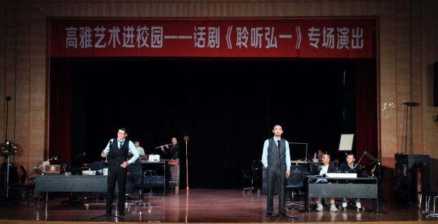 弘一法师,本名李叔同。他写过“长亭外,古道边,芳草碧连天”这样人尽皆知的唱词,也留下了“念念不忘,必有回响”的《晚晴集》。在中国百年的文化史中,李叔同是公认的通才和奇才。无论音乐、戏剧、书法、绘画、诗词皆是一流,是“二十文章惊海内”的艺术巨匠,是中国新文化运动的先驱,最早将油画、钢琴、话剧引入中国。整场话剧通过巧妙运用层次分明的空间布局和牵连不断地时间线索,生动再现了弘一法师的传奇人生。将一个“文化救世”的声音,从二十世纪“民国艺术之父”李叔同的口中传出,师生们在演员精湛的台词功底和形象的动作表演中切身感受到了弘一法师在诗词、书法、音乐、戏剧等艺术多领域的造诣,借着声波,聆听到了有关艺术、爱情、文化、自觉、出世与入世等等跨越时空的话题,让身在今天的我们深受启发。