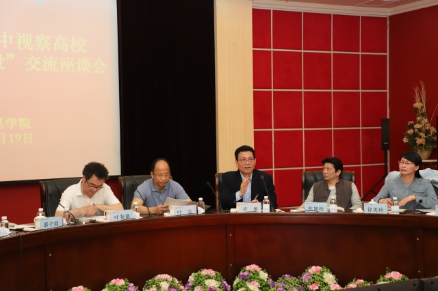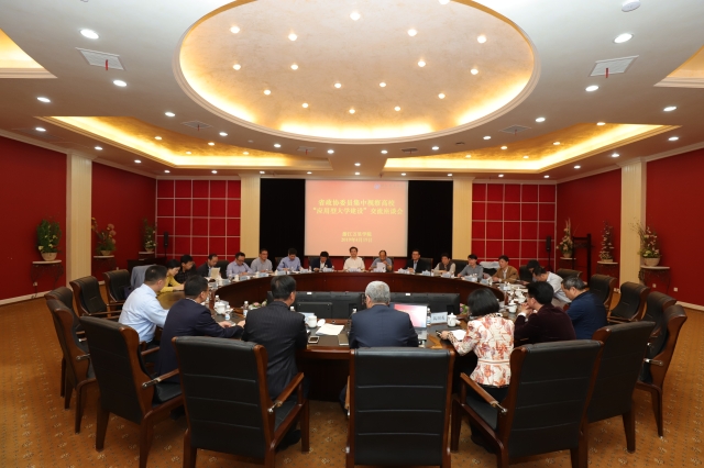 4月19日上午,教科卫体委副主任、民革省委会副主委、杭州市委主委、杭州市政协副主席叶鉴铭,浙江广播电视大学校长、党委副书记叶宏,宁波大学党委书记薛维海,民盟省委会委员、宁波大学副校长邵千钧,浙江外国学院院长、党委副书记洪岗,浙江省万里教育集团董事长、党委书记应雄等18名浙江省政协教育界别活动组前来我校考察座谈。