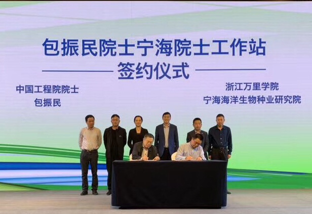 5月15日下午,“包振民院士宁海院士工作站”在2019宁海国际投资洽谈会现代农业专场活动上成功落户万里学院宁海海洋生物种业研究院,该院士工作站为宁海县首个农业领域院士工作站。中国工程院院士包振民,宁海县副县长沈纾丹,浙江万里教育集团副总裁林良富,浙江万里学院副校长、浙江万里学院宁海海洋生物种业研究院院长林志华等出席签约仪式。