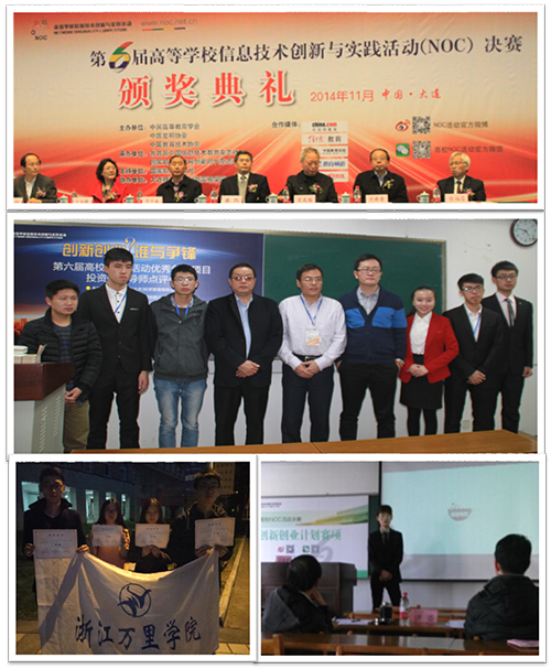 11月14日至16日,第六届“高等学校信息技术创新与实践活动”(NETWORK ORIGINALITY COMPETITION)简称高校NOC活动,决赛在大连理工大学隆重举行。经过层层选拔,我校李安老师带队选送的4个参赛项目取得优异成绩,荣获全国二等奖4项;中国高等学会副秘书长康凯、中国教育电视协会会长宋成栋、教育部直属高校巡视专员周冬成、中国教育技术协会秘书长刘雍潜、中国高等教育学会办公室主任沙玉梅等领导同志出席并为获奖选手颁奖。 “全国普通高校信息技术创新活动”是面向专科以上在校大学生(包括留学生),为增强学生运用信息技术、培养创新思维、提升实践能力、增强知识产权意识而开展的一项活动。第六届高校NOC活动以服务行业应用、贴近用人企业需求为思路,为参赛学生搭建展示个人信息技术应用水平、为参赛学校提供展示教学水平和特点、为用人企业提供发现优秀人才的平台,使学生、学校和企业在活动中共同受益。此项赛事由中国高等教育学会、中国发明协会、中国教育技术协会联合主办,大连理工大学创新实验学院协办。全国近百所本科及高职院校参赛,其中包括上海大学、暨南大学、江南大学等知名本科院校。比赛现场,我校参赛同学自信大方,利用多媒体阐述创业计划书,面对评委的提问有针对性地回答,条理清晰,从容镇定,创意新颖成为比赛的一大亮点。通过激烈角逐,最终,李宏勇、李超宁、叶张健、孙亦然所代表的队伍分别荣获二等奖。 创新是社会发展的源泉,是当今时代前进的主题。我校代表队在连续五届在全国高校NOC大赛获奖,体现了学生创新性思维培养和创业素质与能力提升,也激发了大学生创新创业潜能,对培养大学生团队协作意识、创新精神、实践能力,对促进我校创业型大学的建设方面具有重要意义。