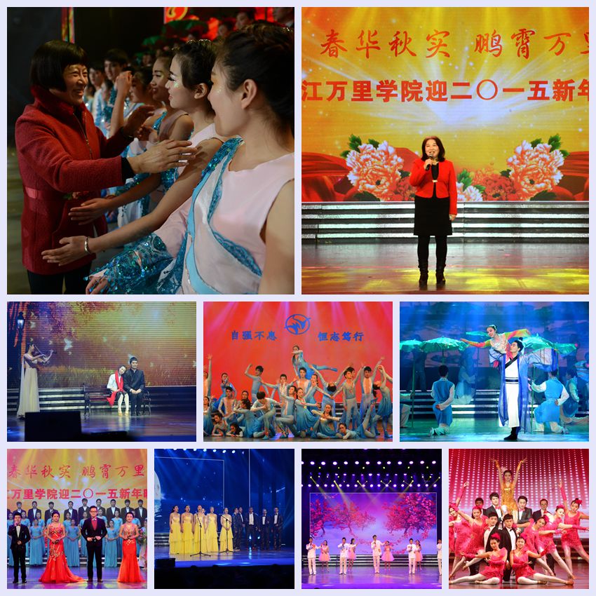 1月8日晚上18点18分,“春华秋实 鹏霄万里”浙江万里学院迎二〇一五新年晚会在素拓隆重举行。浙江省万里教育集团、宁波诺丁汉大学、万里国际学校、万里驾校以及学校相关领导与广大师生们一同观看了演出。 晚会在一首商学院的情景大合唱《春天的故事》中拉开序幕。随后,教师代表2014年度全国模范教师袁葵芳致新年贺词。回首2014年,万里学院始终坚定不移地把育人作为第一要务,在认真践行“以生为本”教育理念的同时,取得了显著成效。袁老师赞扬道:“同学们也是蛮拼的!在各方面都取得了优异的成绩。为万里的决策层点赞,为全体教职员工点赞,为同学们点赞!”展望2015年,高等教育到了全面改革的关键时刻,袁老师代表全体教师表示将努力做有理想信念、有道德情操、有扎实基础、有仁爱之心的好老师,也对同学们寄予了“努力学习,牢记社会责任,能够成为对社会有用之才”的厚望。 在文艺表演环节中,精彩纷呈的节目让观众目不暇接,现场掌声雷动,热闹非凡。校艺术团带来的蒙古舞《天堂草原》舞姿挺拔豪迈,步伐矫健洒脱,还原了蒙古族男性一腔热血的壮志豪情;基础学院满载“奔跑吧 青年”希冀的《在路上》、法学院歌舞《在我生长的地方》、研究生部表演唱《早春的脚步》、设计艺术与建筑学院街舞《Double Boys》、现代物流学院舞蹈《回家》、创新学院双人舞《那年》、校艺术团无伴奏小合唱《半个月亮爬上来》、外语学院当代舞《赤子》、计算机与信息学院歌舞《南海姑娘》、生物与环境学院彩带舞《炫舞青春》、文化与传播学院古典舞《清明上河图•盛世和谐》、电子信息学院情景剧《团圆》等节目让在座师生享受了一场艺术的盛宴。最后,新年晚会在校艺术团带来的歌舞《一杯美酒》中落下帷幕。 木铎金声辞旧岁,三阳开泰迎新春。过去的2014年,我们披荆斩棘,不畏困难;未来的2015年,我们携手共进,继往开来。全体万里人怀揣美好祝愿,齐头并进,紧跟高等教育全面深化改革的步伐,再从春天出发,共襄万里盛举。