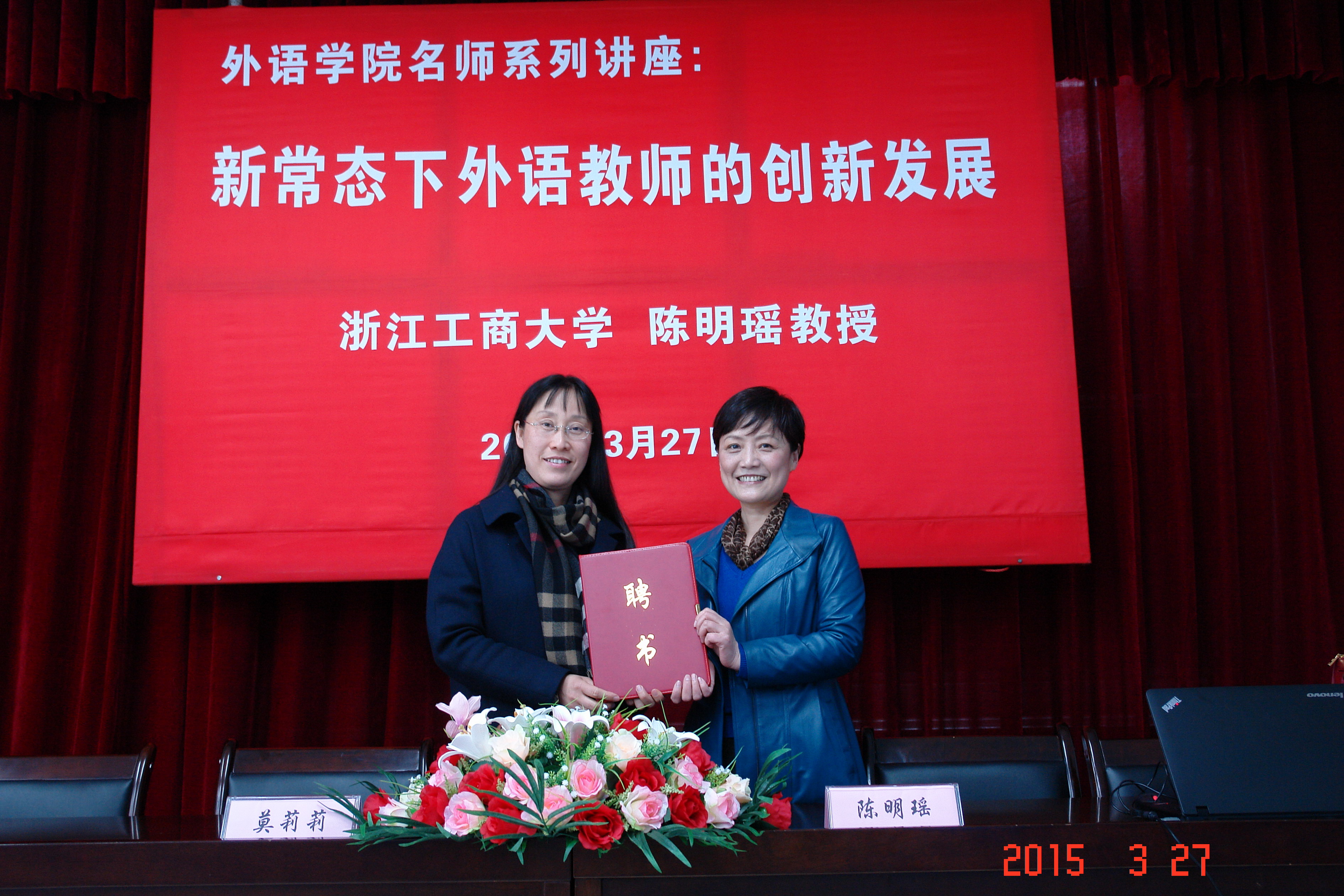 3月27日下午,外语学院名师系列讲座为广大教师带来了一场学术盛宴,浙江工商大学陈明瑶教授以《新常态下外语教师的创新发展》为题作专题讲座。讲座后,陈明瑶教授还受聘担任外语学院名誉教授。 陈明瑶教授治学严谨,取得了丰富的学术成果,近年来,在《中国翻译》、《外国语》、《中国出版》、《外语与外语教学》、《解放军外语学院学报》、《上海翻译》等专业一级刊物和核心刊物上发表学术论文30余篇,出版专著3部,字典2部。 主持或参与完成二十余项国家级、省级、市校级科研项目,如全国十二教育规划课题、浙江省哲社规划课题、浙江省教育厅重点教材项目等。 讲座伊始,陈教授便用一组数据简要概括了当前外语教师生存发展现状,引发了在座老师的深刻思考。接着,陈教授敏锐地分析了当前外语教师发展中所存在的问题,并提出外语教师的创新发展是解决这些问题的根本对策。 陈教授指出,要实现英语教师的创新发展,教师首先要确定自己的学科和专业领域,并在研究内容、研究方法、专业实践等领域进行创新。最后,陈教授就创新研究的课题申报给出具体实用的指导意见,并分享了自己将要进行的一些研究课题,拓宽了老师们的思路。讲座风趣幽默,深入浅出,不断用生活中的例子佐证教学,引发思考,老师们感到深受启发。 作为外语学院的名誉教授,陈教授将给青年教师在科研、教学等领域给予专业指导,襄助外语学院的学科发展。