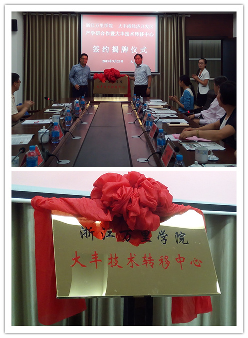2015年9月29日下午,浙江万里学院和江苏省大丰港经济开发区“产学研合作暨浙江万里学院大丰技术转移中心”签约和揭牌仪式在江苏海洋产业研究院举行。浙江万里学院校长助理、科技部部长林志华和江苏省大丰港经济开发区管委会副主任柏健代表各自单位在协议书上签字。我校首个省外技术(成果)转移中心落户江苏大丰。