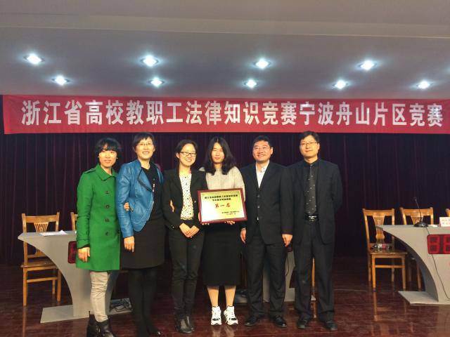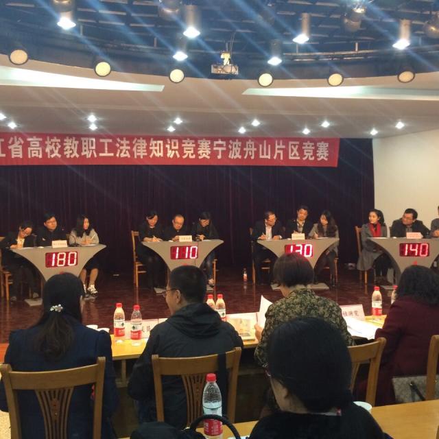 2015年11月19日下午2点,浙江省高校教职工法律知识竞赛宁波舟山片区竞赛在宁波大学工会三楼多功能厅准时举行。本次比赛本科组和高职组分别进行竞赛。其中本科组的参赛队伍包括宁波大学代表队、浙江万里学院代表队、浙江大学宁波理工学院代表队和浙江海洋学院代表队。我校代表队由法学院的余妙宏老师、余海鸥老师和外语学院的蒯烨老师组成。只见各代表队的队员们早早来到现场,进行赛前的最后准备,多功能厅座无虚席。