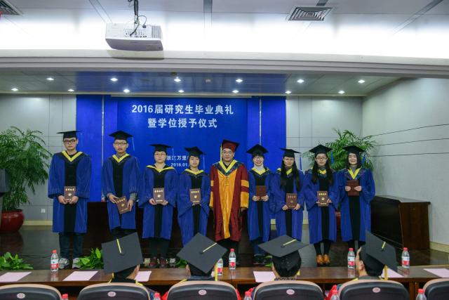 副校长钱国英宣读了《浙江万里学院关于授予丁浩淼等61位同学硕士专业学位的决定》和《浙江万里学院关于授予巩朵朵等10名同学“2016届浙江万里学院优秀毕业研究生”称号的决定》。随后,校领导为2016届优秀毕业研究生颁发荣誉证书并合影留念。在欢快流淌的优美乐曲中,2016届研究生依次上台,应敏执行校长为每一位毕业生正冠拨穗授予学位并合影。
