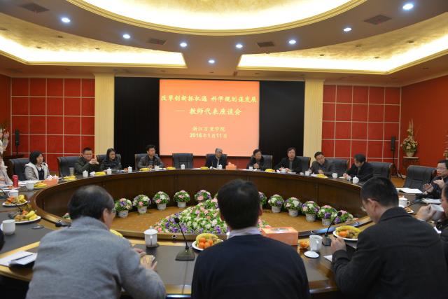 2016年1月11日下午,迎新春教师代表座谈会在行政楼112会议室召开。来自各学院的19名教师代表参加。执行校长应敏,纪委书记、工会主席陈建荣,校办、组织部、教务部、人事部等部门负责人参加了座谈。