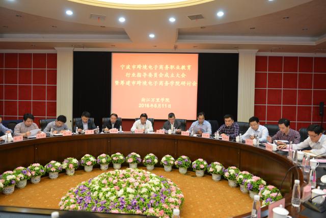 为贯彻落实宁波市国民经济十三五发展规划纲要,建设好宁波国家跨境电子商务综合试验区,加快电商人才队伍培养,解决跨境电商人才短缺、服务跨境电商产业能力不足,有力支撑我市电子商务发展水平。2016年5月11日下午,宁波市跨境电子商务职业教育行业指导委员会成立大会暨筹建市跨境电子商务学院研讨会在浙江万里学院行政楼隆重举行。宁波市口岸打私办主任、跨境电商行指委主任丁海滨,浙江省万里教育集团总裁、党委书记应雄,浙江万里学院执行校长应敏,宁波市商务委副主任缪永法,宁波市教育局副局长胡赤弟和电商企业代表及高校代表共40余人参加了会议。会议由宁波口岸打私办副书记、副主任杨峰主持。