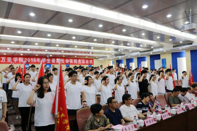 仪式最后,全体实践队员代表在学校暑期社会实践宣传总队张静同学的带领下集体宣誓,将秉承学校“自强不息、恒志笃行”的校训,发扬万里学子的大爱精神,脚踏实地、锐意创新,运用所学知识服务社会,听从组织安排、遵守团队纪律,为全面展示万里学子风采努力实践。
